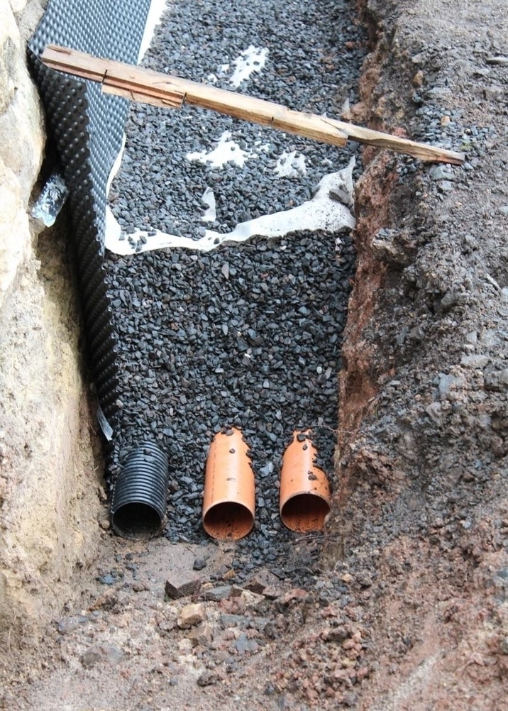 Neben dem Betonfundament wird ein Drainagesystem eingebaut (Kies, Geotextil, Drainagerohre).