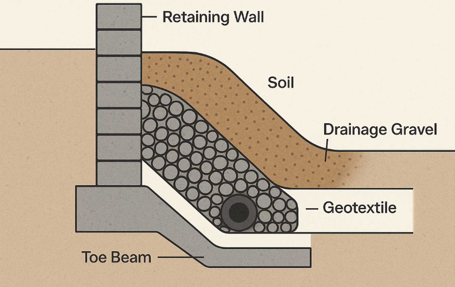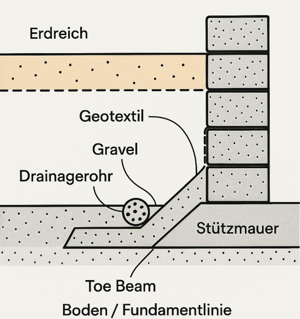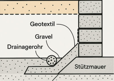 Dies verhindert Wasserdruck und Risse in der Mauer. Besonders wichtig bei Hanglagen oder lehmigen Böden.
