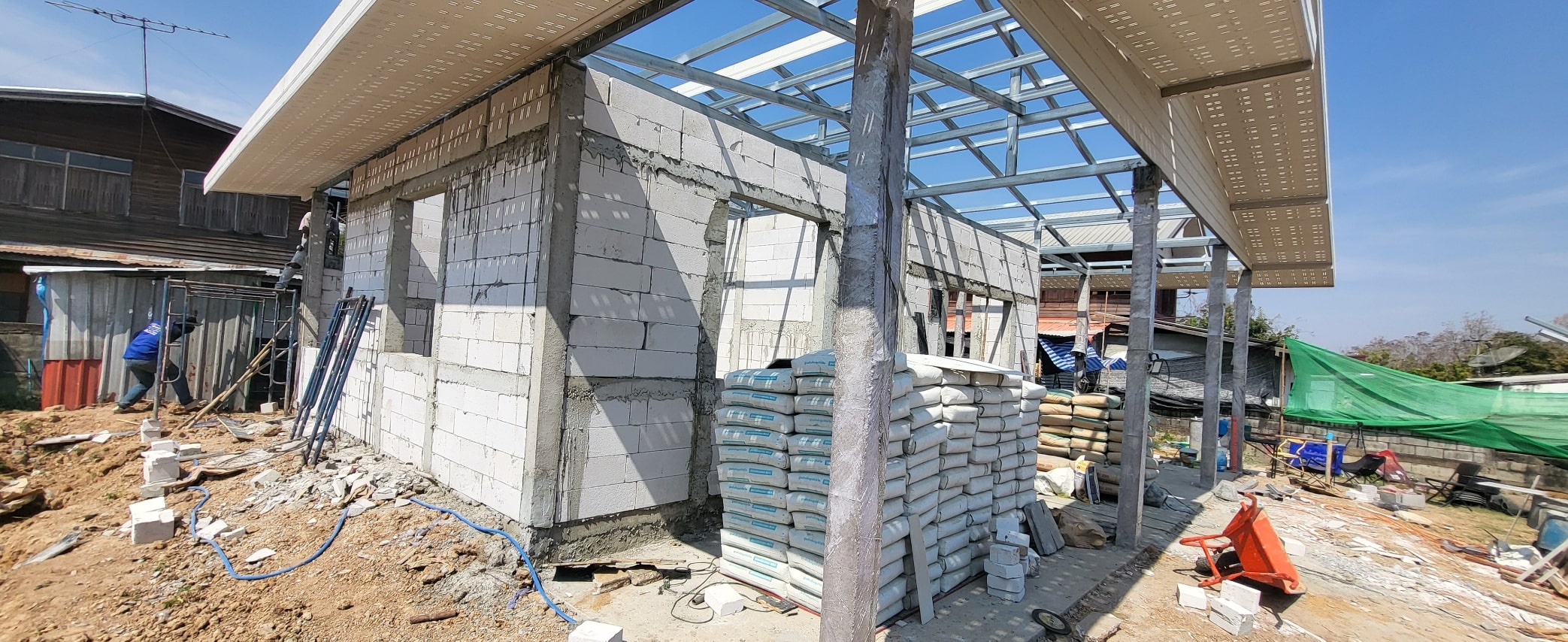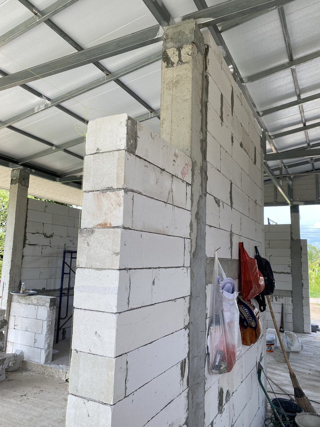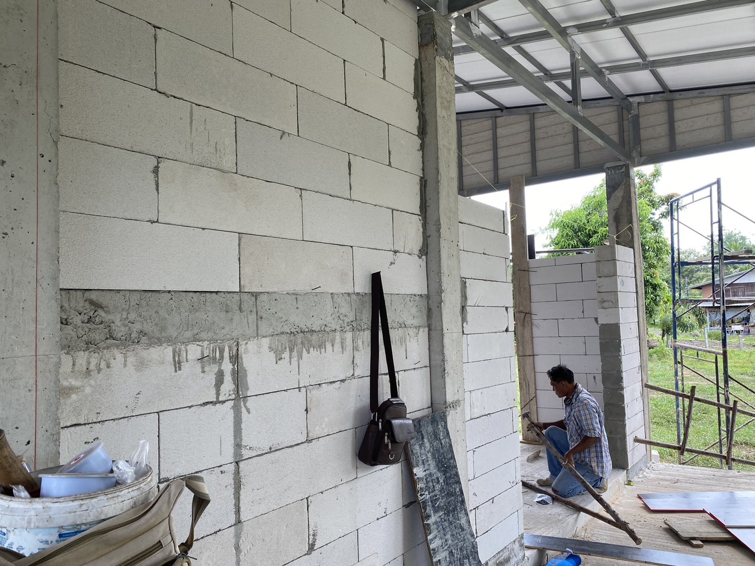 In Thailand werden Hauswände fast immer als Ausfachung in Stahlbetonrahmen gebaut: Betonstützen und Ringanker übernehmen die tragende Funktion, während das Mauerwerk nur füllt.