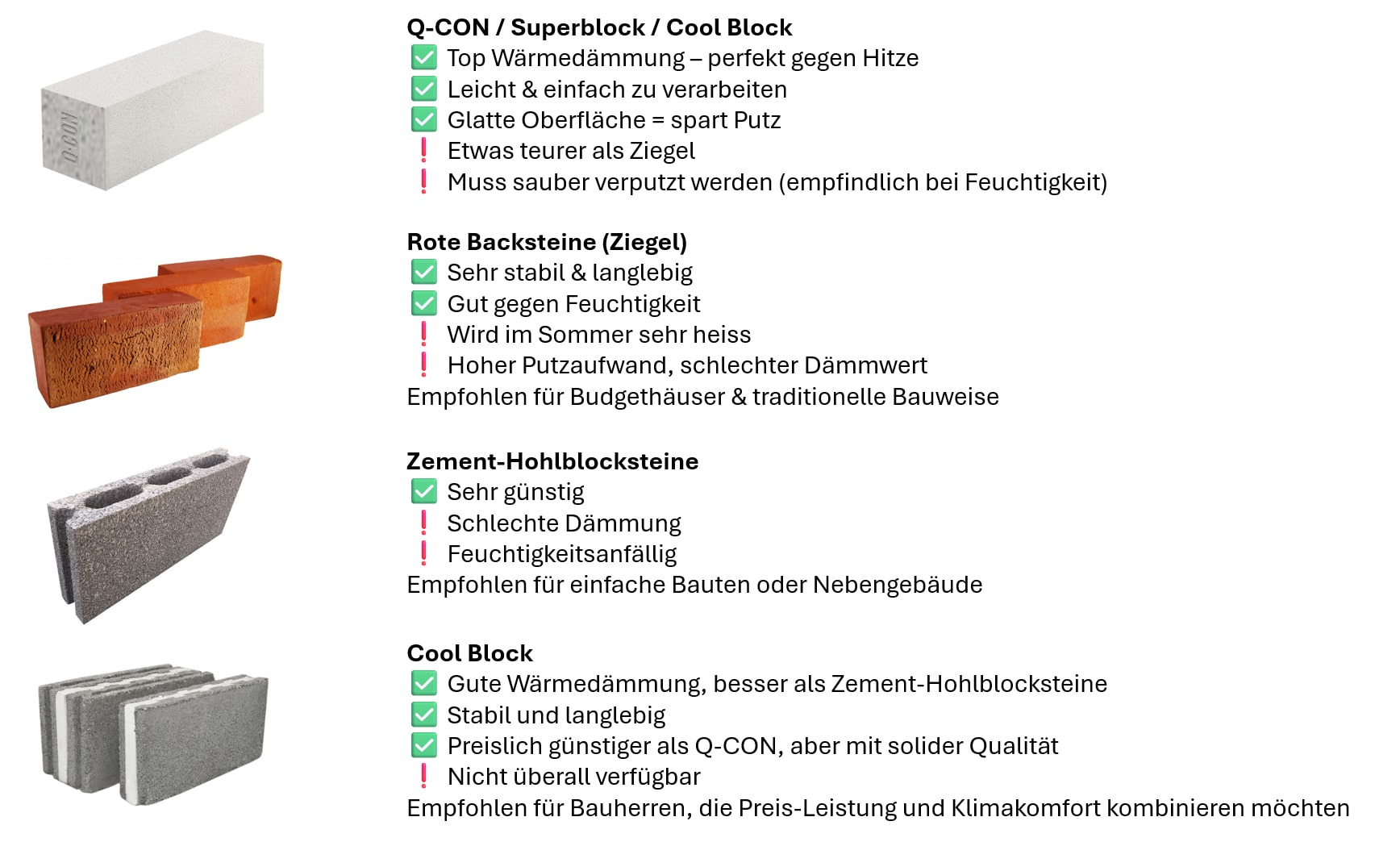 • Cool Blocks: spezielle Leichtbetonsteine mit verbesserten Dämmwerten. Sie bieten einen guten Kompromiss zwischen Stabilität und Klimakomfort und werden zunehmend als Alternative zu Q-Con genutzt.